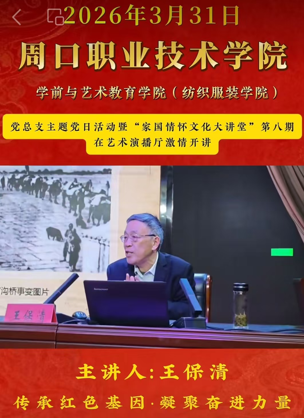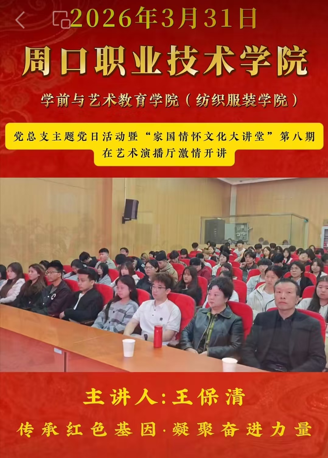 本网讯(记者程东建 通讯员 彭世繁)3月31日,在河南省周口市职业技术学院,一堂生动活泼“传承红色基因,凝聚奋进力量”的“红色”报告会,紧张有序进行。上千名职业技术学院师生,全神贯注聆听了报告会。