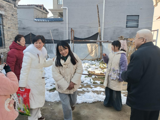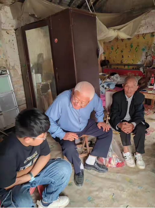 张新芳带领外孙到西华县聂堆镇黄岗村看望乞讨老人李文君