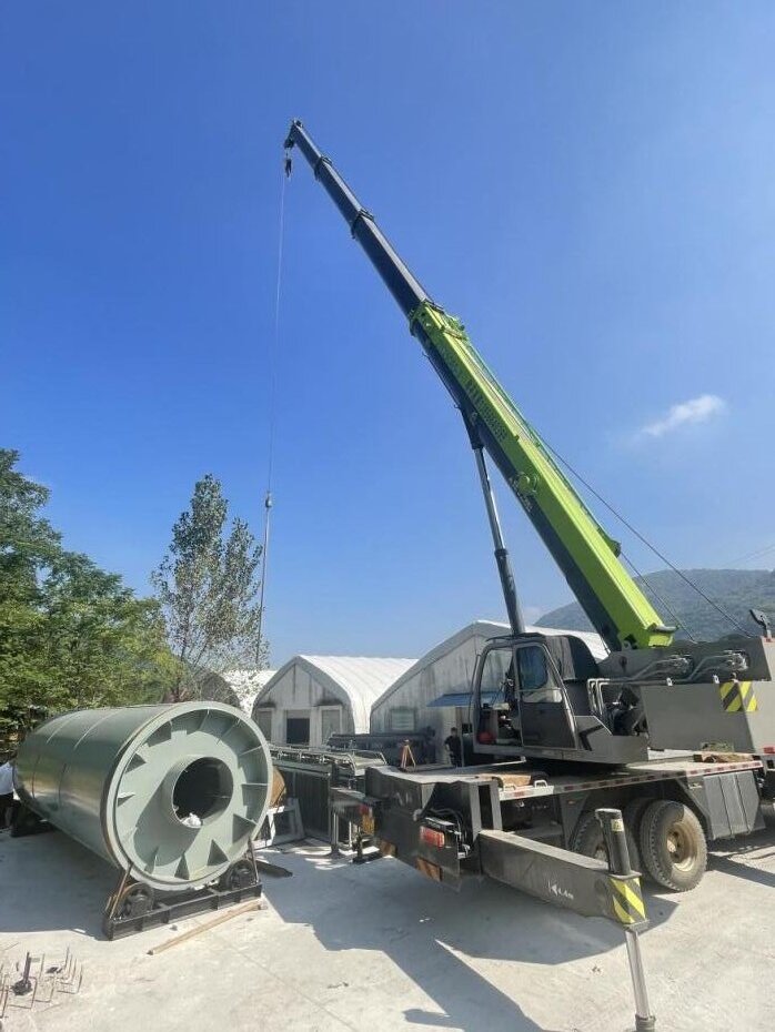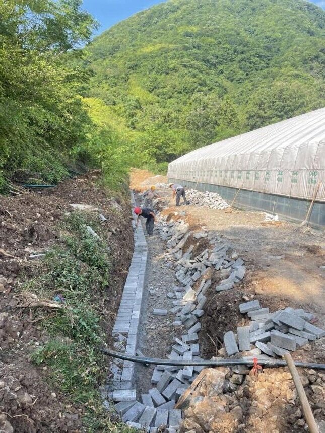施工现场,工人师傅们分工明确,有的在精心砌筑排水渠道,灰色砖块在山间垒起整齐的“水脉防线”,保障厂房区域排水通畅;不远处,大型起重机正平稳吊运大型设备,为桑叶烘干厂房的核心设施安装“添砖加瓦”。旁边的温室大棚与青山绿树相映成趣,勾勒出乡村产业发展的鲜活图景。