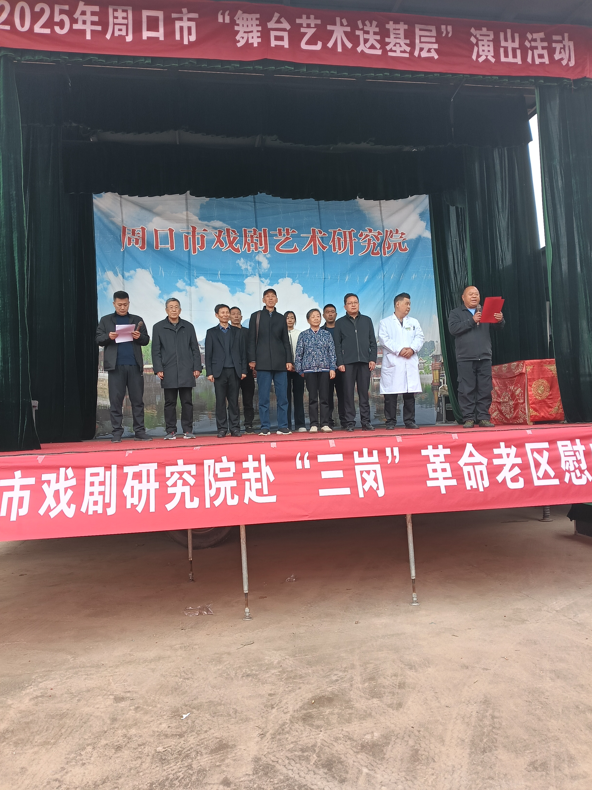 周口市老促会副秘书长赵作鹏宣读了市老促会对老区人民的慰问信,慰问信指出,“三岗”是革命老区,这里曾是豫东特委所在地,沈东平、王其梅等老一代革命家在“三岗”建立了党的组织和军事指挥中心,点燃了抗日的烽火;这里曾被誉为“小延安”,大批热血青年和有志之士投奔“三岗”,投身革命,报效国家;这里也曾被称为“小抗大”,举办过多期政治、军事骨干培训班,为组建抗日游击队输送了人材;这里曾是普理学校所在地,在“三岗”普及真理之光,为中国革命和建设培养了众多栋梁之才;这里曾是中国共产党直接领导的一支人民武装诞生地,胡晓初、屈申亭、侯香山等“三岗”英雄,率家乡子弟兵接受共产党的领导和指挥,南征北战,屡建奇功,成为新四军抗日游击支队的骨干力量。“三岗”的贡献和革命历史彪炳史册。党和国家时刻关心关怀“三岗”的建设和人民的福祉,1956年,河南省人民政府老区慰问团专程来“三岗”进行了慰问,并在普理学校院内建立了豫东特委纪念塔,2016年又被河南省人民政府列为河南省文物保护单位,成为传承红色基因、弘扬老区精神的重要场所。今天,我们组织周口市戏剧艺术研究院、周口市眼科医院,来“三岗”进行义演、义诊,借此机会,我们向“三岗”老区的父老乡亲表示亲切的慰问,向老区的革命先辈表示崇高的敬意!
