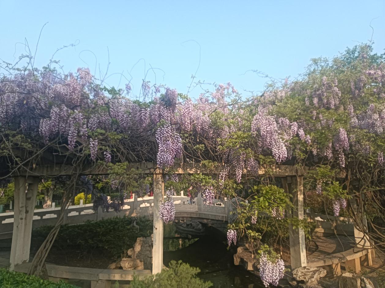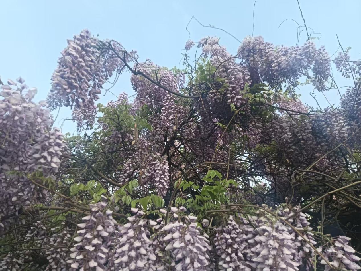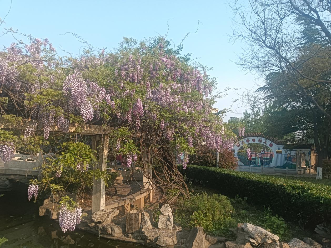 若说公园的绿是钢城春日的底色,那幼儿园旁的紫藤花长廊,便是春日里最惊艳的一抹亮色。长廊两侧,紫藤花肆意绽放,一串串紫莹莹的花穗垂挂枝头,随风轻舞,暗香浮动,美不胜收。紫藤花自古便是吉祥的象征,承载着人们对美好生活的期许,寓意着吉祥如意、岁岁安康。这一片绚烂的紫藤花海,不仅装点了厂区的春光,更温暖了每一个人的眼眸,让钢城的春天多了几分温婉与浪漫,也让这份吉祥的美好,萦绕在每一位 2672 人的心头。